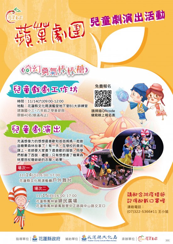 一、蘋果劇團《奇幻勇氣棒棒糖》兒童劇演出活動訊息如下: (一)活動日期及地點: 1、戲劇工作坊: 109 年 11 月 14 (週六)上午 9 時,地點: 本局演藝堂 B1 大排練室。 2、演出場次 1 : 109 年 11 月 14 (週六)下午 16 時,地點: 本局演藝堂戶外舞台。 3、演出場次 2 : 109 年 11 月 15 (週日)下午 16 時,地點: 鳳林鎮民廣場。