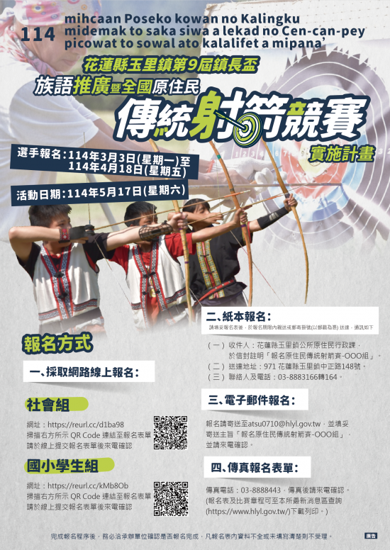 2、 | 紙本報名:填妥報名表,於報名期限內親送或郵寄掛號(以郵戳為憑) 送達本所原住民行政課(地址:花蓮縣玉里鎮中正路 148 號),信封註明「報名原住民傳統射箭賽-OOO 組」(例:報名原住民傳統射箭賽-社會組)。 |